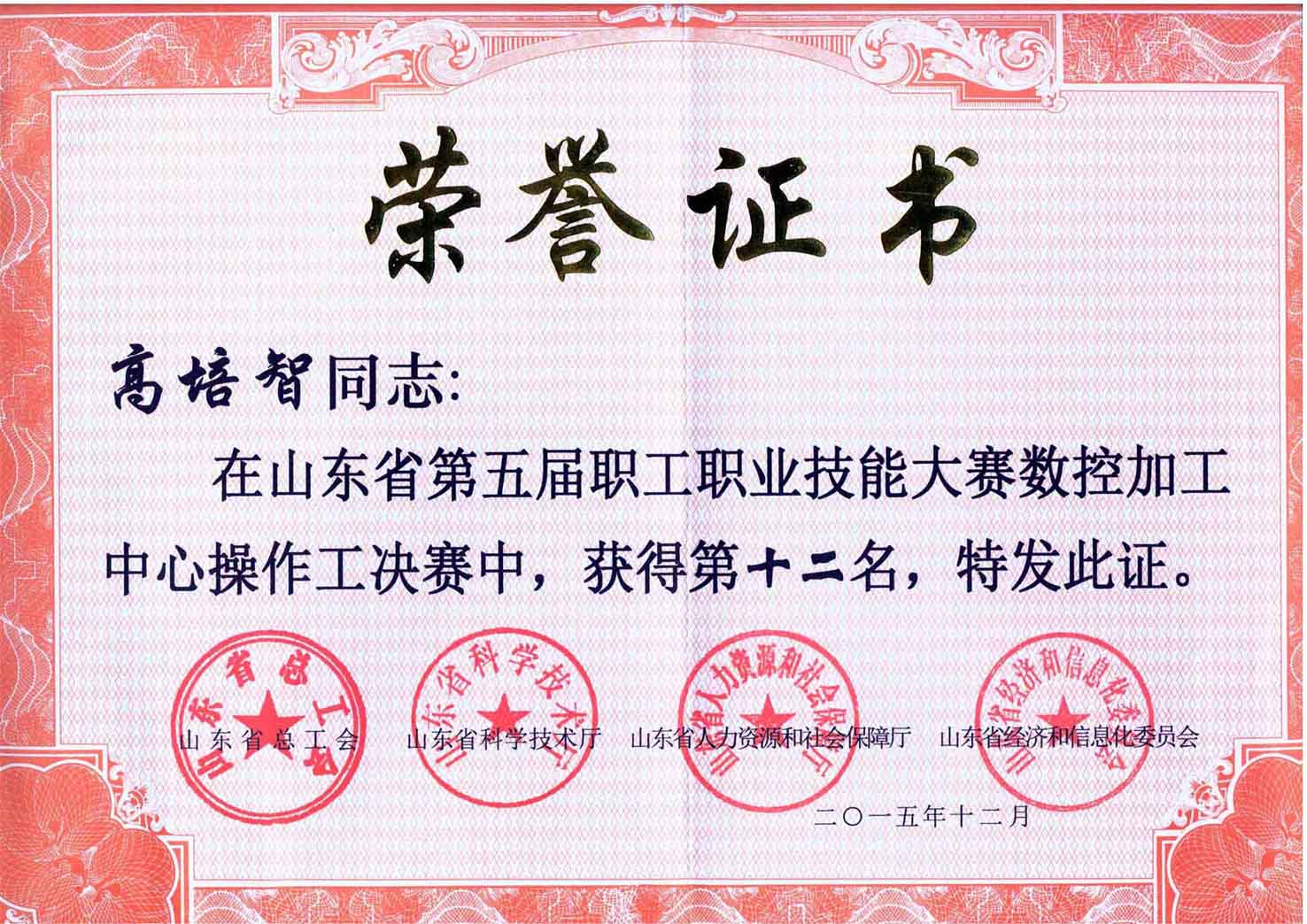 公司員工高培智在山東省第五屆職工職業(yè)技能大賽數(shù)控加工中心操作工決賽中,獲得第十二名,日前受到省總工會(huì)、省科技廳、省人力資源和社會(huì)保障廳和省經(jīng)信委四部門(mén)聯(lián)合表彰。