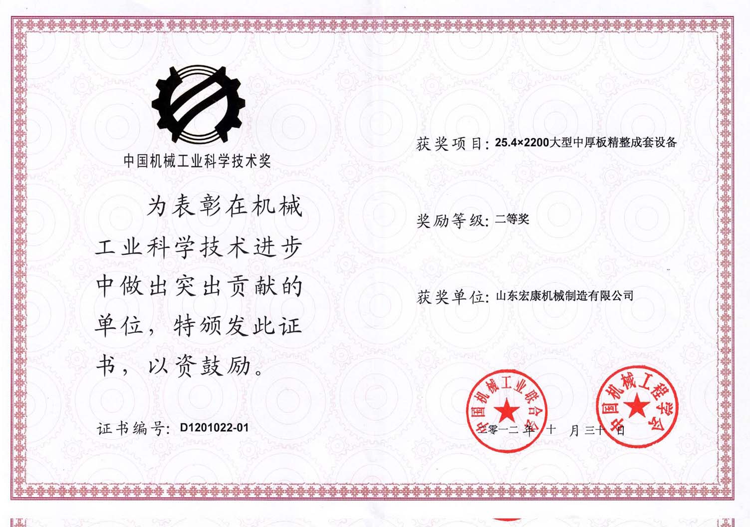 機械工業(yè)科學技術進步貢獻獎