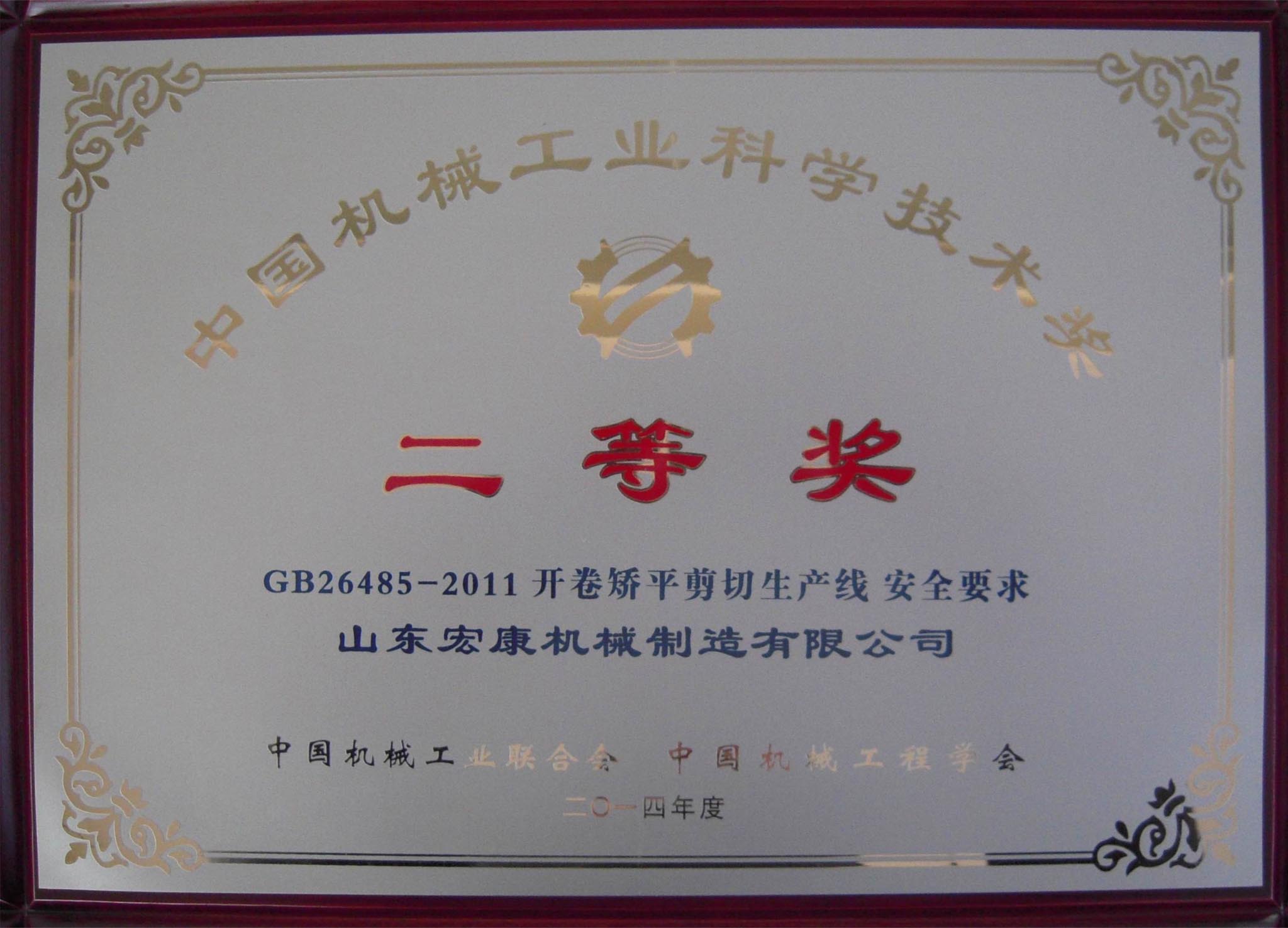 根據(jù)中國(guó)機(jī)械工業(yè)科學(xué)技術(shù)獎(jiǎng)勵(lì)工作辦公室《關(guān)于表彰2014年度中國(guó)機(jī)械工業(yè)科學(xué)技術(shù)獎(jiǎng)獎(jiǎng)勵(lì)項(xiàng)目的通報(bào)》,集團(tuán)公司主持制定的《GB26485-2011 開(kāi)卷矯平剪切生產(chǎn)線 安全要求》國(guó)家標(biāo)準(zhǔn)獲中國(guó)機(jī)械工業(yè)科學(xué)技術(shù)進(jìn)步二等獎(jiǎng)。